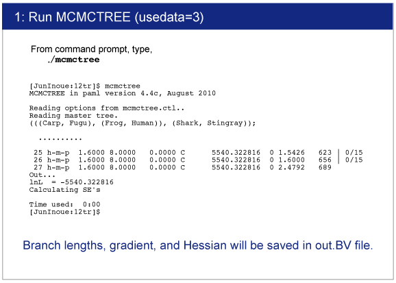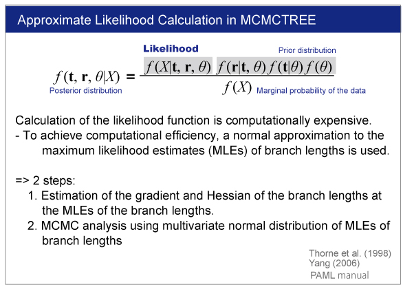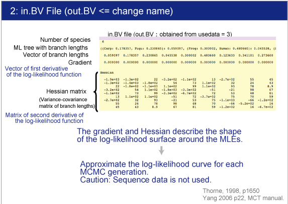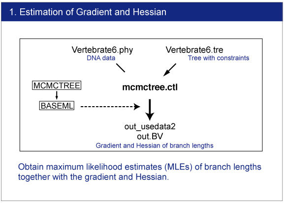 | The branch lengths are estimated by maximum likelihood together with the gradient and Hessian (i.e. vector of first derivatives and matrix of second derivatives) of the likelihood function at the maximum likelihood estimates. The gradient and Hessian contain information about the curvature of the likelihood surface (dos Reis and Yang, 2013, P10). |