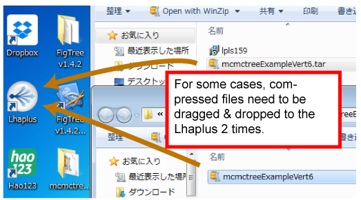 - Unzip.Drag & drop the downloaded mcmctreeEasyExam.tar.tar (or mcmctreeEasyExam.tar) file,to the Lhaplus alias (desktop).