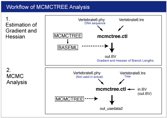 MCMCTREE is a phylogenetic program for Bayesian estimation of species divergence times using soft fossil constraints under various molecular clock models. This is part of the PAML package. In this tutorial I will analyze an easy example modified from dataset of Inoue et al. (2010). Here we conduct a commonly used time estimation method, "Approximate Likelihood Method", for the datasets including more than 10 species.
