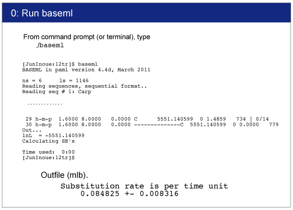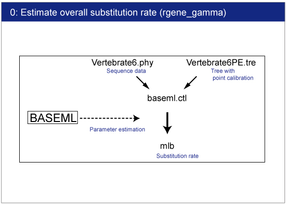 We will estimate overall substitution rate in this dataset. This estimates will be used in rgene_gamma setting in mcmctree.ctl later. paml4.9i does not write "Substitution rate is per time unit" in the outfile. Please use v4.8 from Old versions.