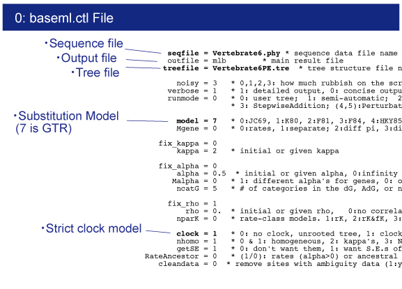 Open baseml.ctl by your editor.Sequence file (Vertebrate6.phy) and tree file (Vertebrate6PE.tre) names are written.GTR+G model (model = 7) will be used for rate estimation.Strict clock model (clock = 1) is used because of quick estimation.