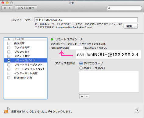 ホスト名とアドレスは,上記リモートログインをチェックしたときに現れます.自分が今使っている Mac 自身に入ることもできるので,試してみるのも良いでしょう.